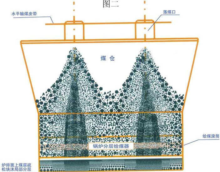 鍋爐混煤機(jī)是針對(duì)機(jī)械聯(lián)合輸送上煤方式鍋爐,單獨(dú)使用鍋爐分層給煤器效果不好其原因(如圖二),近年來(lái)研發(fā)的產(chǎn)品,其作用相當(dāng)于建筑用砂漿攪拌機(jī),將由輸煤皮帶上自然下落進(jìn)入煤倉(cāng)形成塊、沫分離的煤進(jìn)行攪拌混合,根據(jù)單位時(shí)間煤耗量利用變頻器調(diào)整轉(zhuǎn)速,使塊、沫和干、濕度(配套均勻加水裝置)充分混合均勻。